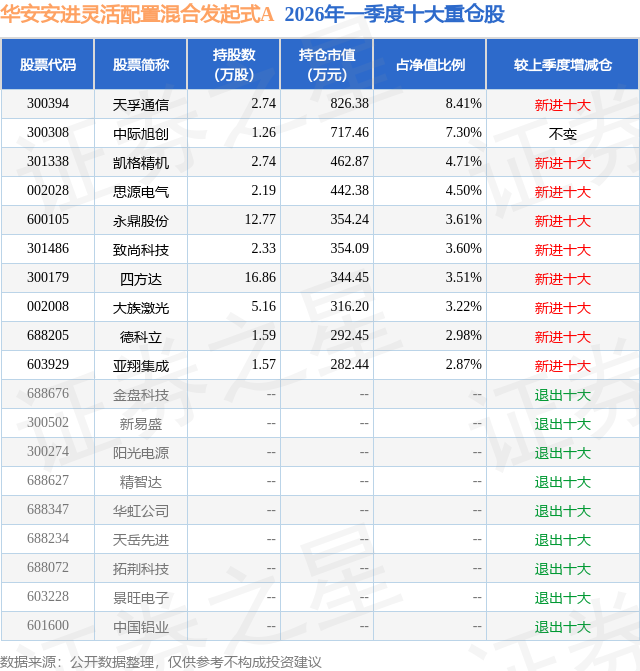 从基金规模来看,华安安进灵活配置混合发起式A基金2026年一季度公布的基金规模为0.9亿元,较上一期规模9498.32万元变化了-463.56万元,环比变化了-4.88%。该基金最新一期资产配置为:股票占净值比68.63%,无债券类资产,现金占净值比7.79%。从基金持仓来看,该基金当季前十大股票仓位达44.71%,第一大重仓股为天孚通信(300394),持仓占比为8.41%。