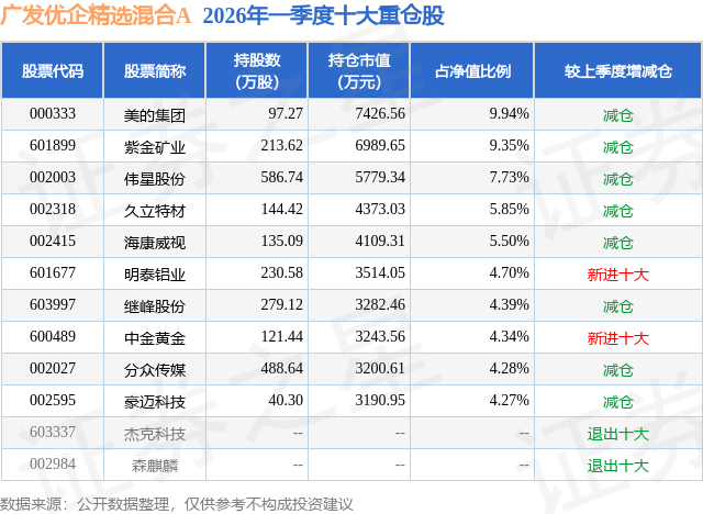 从基金规模来看,广发优企精选混合A基金2026年一季度公布的基金规模为7.15亿元,较上一期规模13.23亿元变化了-6.08亿元,环比变化了-45.97%。该基金最新一期资产配置为:股票占净值比94.78%,无债券类资产,现金占净值比5.32%。从基金持仓来看,该基金当季前十大股票仓位达60.35%,第一大重仓股为美的集团(000333),持仓占比为9.94%。