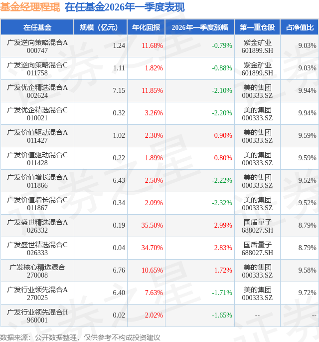 证券之星消息,日前广发优企精选混合A基金公布一季报,2026年一季度最新规模7.15亿元,季度净值涨幅为-2.1%。
