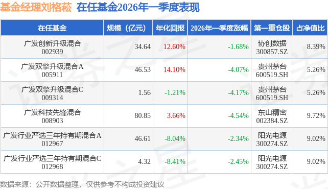 证券之星消息,日前广发创新升级混合基金公布一季报,2026年一季度最新规模34.64亿元,季度净值涨幅为-1.68%。