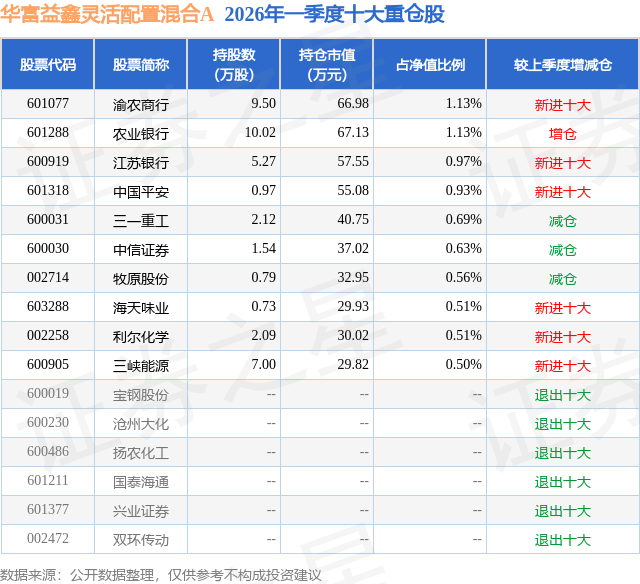 从基金规模来看,华富益鑫灵活配置混合A基金2026年一季度公布的基金规模为0.38亿元,较上一期规模7651.95万元变化了-3843.96万元,环比变化了-50.24%。该基金最新一期资产配置为:股票占净值比23.4%,债券占净值比64.73%,现金占净值比1.14%。从基金持仓来看,该基金当季前十大股票仓位达7.56%,第一大重仓股为渝农商行(601077),持仓占比为1.13%。