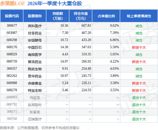 从基金规模来看,多策略LOF基金2026年一季度公布的基金规模为0.3亿元,较上一期规模3.47亿元变化了-3.16亿元,环比变化了-91.21%。该基金最新一期资产配置为:股票占净值比84.02%,无债券类资产,现金占净值比12.56%。从基金持仓来看,该基金当季前十大股票仓位达53.69%,第一大重仓股为英科医疗(300677),持仓占比为9.62%。