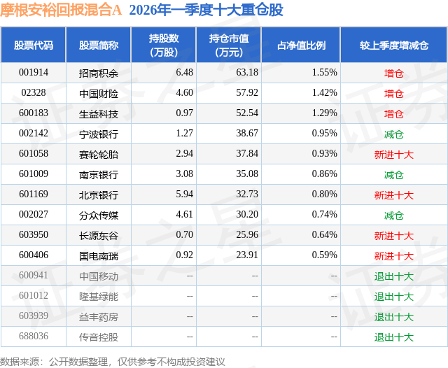 证券之星消息,日前摩根安裕回报混合A基金公布一季报,2026年一季度最新规模0.22亿元,季度净值涨幅为0.69%。