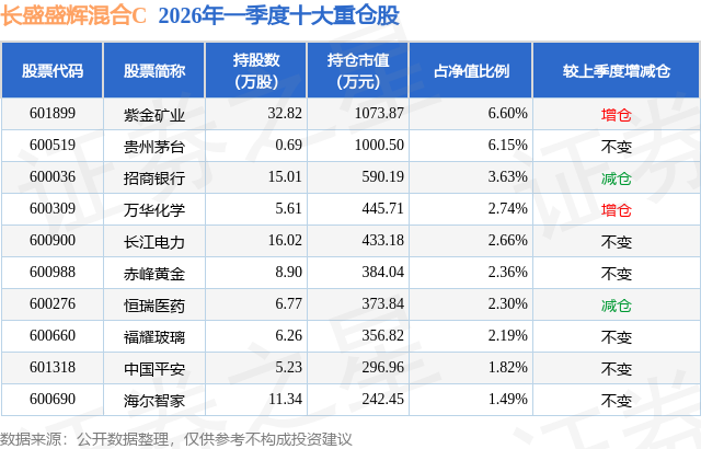 从基金规模来看,长盛盛辉混合C基金2026年一季度公布的基金规模为0.12亿元,较上一期规模1042.51万元变化了141.45万元,环比变化了13.57%。该基金最新一期资产配置为:股票占净值比48.9%,债券占净值比86.66%,现金占净值比0.46%。从基金持仓来看,该基金当季前十大股票仓位达31.94%,第一大重仓股为紫金矿业(601899),持仓占比为6.6%。