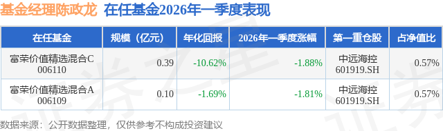从基金规模来看,富荣价值精选混合A基金2026年一季度公布的基金规模为0.1亿元,较上一期规模1126.4万元变化了-166.44万元,环比变化了-14.78%。该基金最新一期资产配置为:股票占净值比12.42%,债券占净值比41.1%,现金占净值比44.35%。从基金持仓来看,该基金当季前十大股票仓位达3.48%,第一大重仓股为中远海控(601919),持仓占比为0.57%。