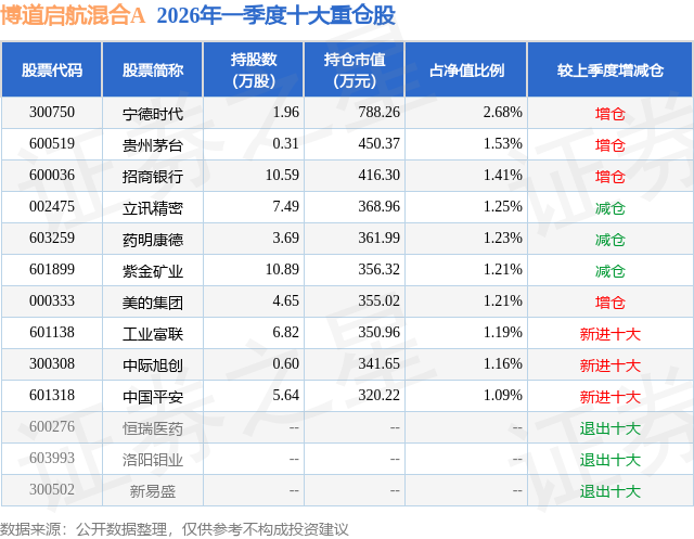 从基金规模来看,博道启航混合A基金2026年一季度公布的基金规模为1.61亿元,较上一期规模2.0亿元变化了-3861.19万元,环比变化了-19.34%。该基金最新一期资产配置为:股票占净值比85.45%,债券占净值比5.35%,现金占净值比10.08%。从基金持仓来看,该基金当季前十大股票仓位达13.96%,第一大重仓股为宁德时代(300750),持仓占比为2.68%。