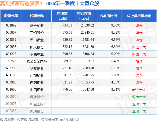 从基金规模来看,嘉实资源精选股票A基金2026年一季度公布的基金规模为13.01亿元,较上一期规模3.03亿元变化了9.98亿元,环比变化了329.59%。该基金最新一期资产配置为:股票占净值比94.55%,无债券类资产,现金占净值比6.2%。从基金持仓来看,该基金当季前十大股票仓位达60.31%,第一大重仓股为紫金矿业(601899),持仓占比为9.55%。