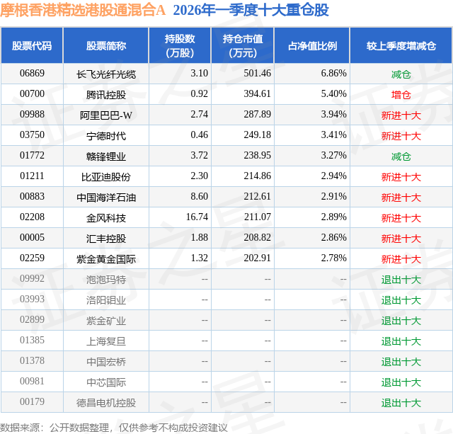 从基金规模来看,摩根香港精选港股通混合A基金2026年一季度公布的基金规模为0.5亿元,较上一期规模3758.75万元变化了1229.64万元,环比变化了32.71%。该基金最新一期资产配置为:股票占净值比75.59%,无债券类资产,现金占净值比23.98%。从基金持仓来看,该基金当季前十大股票仓位达37.26%,第一大重仓股为长飞光纤光缆(06869),持仓占比为6.86%。
