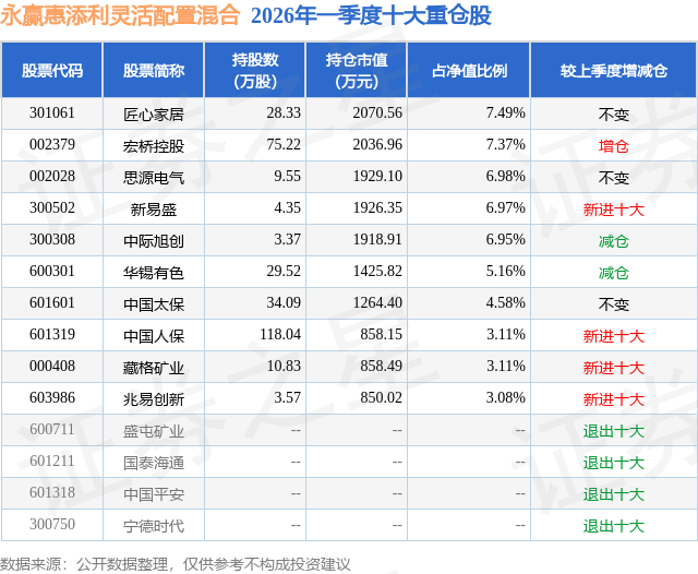 证券之星消息,日前永赢惠添利灵活配置混合基金公布一季报,2026年一季度最新规模2.76亿元,季度净值涨幅为-4.31%。