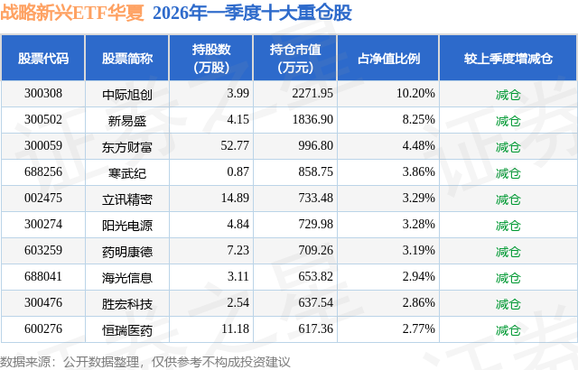 从基金规模来看,战略新兴ETF华夏基金2026年一季度公布的基金规模为2.23亿元,较上一期规模2.62亿元变化了-3900.02万元,环比变化了-14.91%。该基金最新一期资产配置为:股票占净值比99.14%,无债券类资产,现金占净值比1.04%。从基金持仓来看,该基金当季前十大股票仓位达45.12%,第一大重仓股为中际旭创(300308),持仓占比为10.2%。