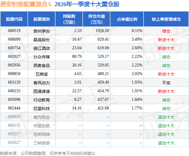 从基金规模来看,诺安积极配置混合A基金2026年一季度公布的基金规模为1.97亿元,较上一期规模2.13亿元变化了-1624.62万元,环比变化了-7.62%。该基金最新一期资产配置为:股票占净值比76.53%,无债券类资产,现金占净值比22.44%。从基金持仓来看,该基金当季前十大股票仓位达28.11%,第一大重仓股为贵州茅台(600519),持仓占比为8.11%。