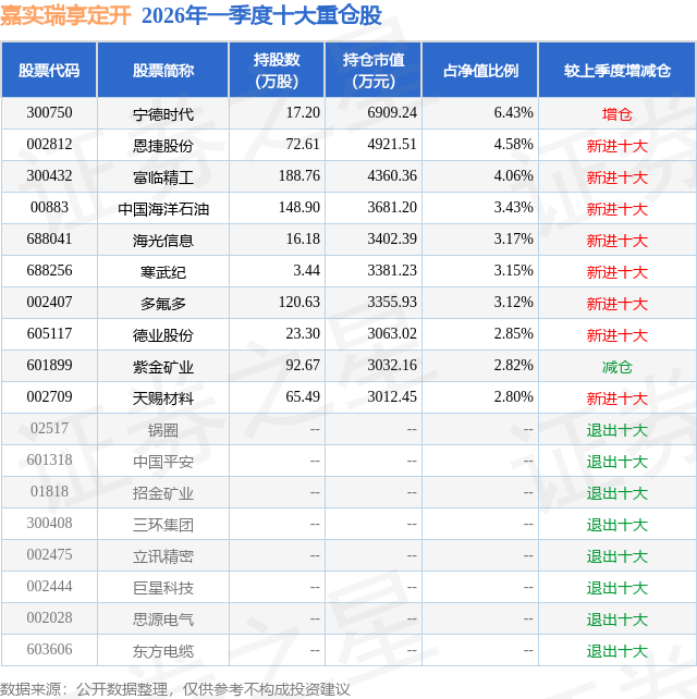 从基金规模来看,嘉实瑞享定开基金2026年一季度公布的基金规模为10.74亿元,较上一期规模9.48亿元变化了1.26亿元,环比变化了13.32%。该基金最新一期资产配置为:股票占净值比72.92%,无债券类资产,现金占净值比25.3%。从基金持仓来看,该基金当季前十大股票仓位达36.41%,第一大重仓股为宁德时代(300750),持仓占比为6.43%。