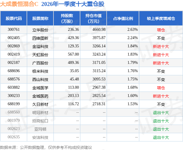 从基金规模来看,大成景恒混合C基金2026年一季度公布的基金规模为11.47亿元,较上一期规模4.32亿元变化了7.15亿元,环比变化了165.49%。该基金最新一期资产配置为:股票占净值比93.88%,债券占净值比4.55%,现金占净值比1.87%。从基金持仓来看,该基金当季前十大股票仓位达18.65%,第一大重仓股为立华股份(300761),持仓占比为2.63%。