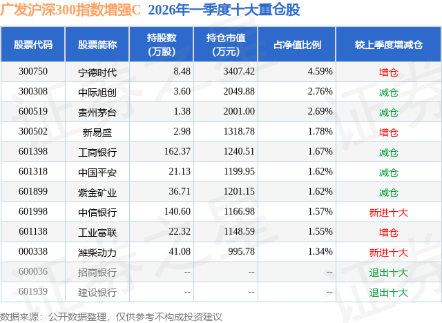 从基金规模来看,广发沪深300指数增强C基金2026年一季度公布的基金规模为2.52亿元,较上一期规模5.16亿元变化了-2.64亿元,环比变化了-51.22%。该基金最新一期资产配置为:股票占净值比94.41%,无债券类资产,现金占净值比5.86%。从基金持仓来看,该基金当季前十大股票仓位达21.19%,第一大重仓股为宁德时代(300750),持仓占比为4.59%。