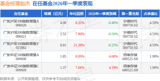 证券之星消息,日前广发沪深300指数增强C基金公布一季报,2026年一季度最新规模2.52亿元,季度净值涨幅为-0.5%。