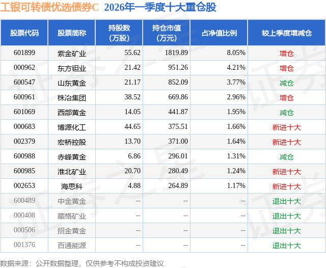 从基金规模来看,工银可转债优选债券C基金2026年一季度公布的基金规模为1.03亿元,较上一期规模3116.12万元变化了7162.56万元,环比变化了229.86%。该基金最新一期资产配置为:股票占净值比36.77%,债券占净值比92.34%,现金占净值比3.56%。从基金持仓来看,该基金当季前十大股票仓位达27.96%,第一大重仓股为紫金矿业(601899),持仓占比为8.05%。