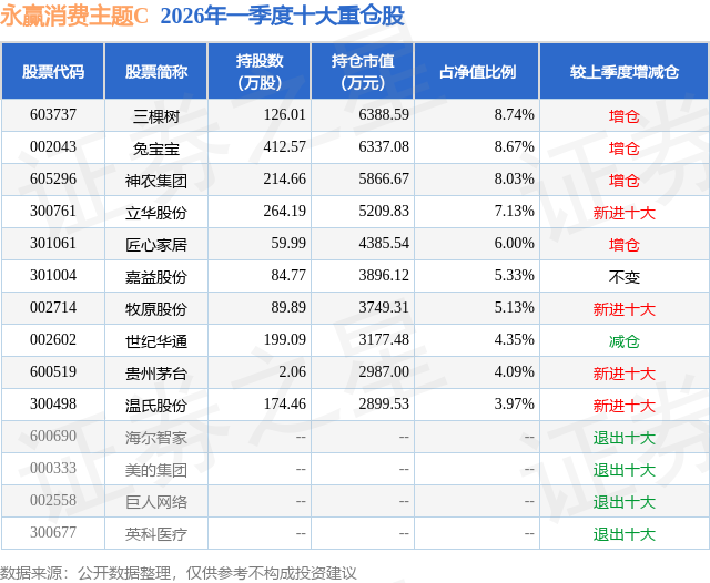 从基金规模来看,永赢消费主题C基金2026年一季度公布的基金规模为4.17亿元,较上一期规模2.0亿元变化了2.17亿元,环比变化了108.42%。该基金最新一期资产配置为:股票占净值比73.03%,无债券类资产,现金占净值比24.63%。从基金持仓来看,该基金当季前十大股票仓位达61.44%,第一大重仓股为三棵树(603737),持仓占比为8.74%。