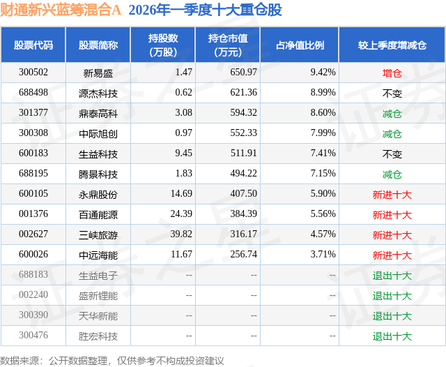 从基金规模来看,财通新兴蓝筹混合A基金2026年一季度公布的基金规模为0.4亿元,较上一期规模2443.75万元变化了1572.33万元,环比变化了64.34%。该基金最新一期资产配置为:股票占净值比92.84%,债券占净值比5.12%,现金占净值比0.69%。从基金持仓来看,该基金当季前十大股票仓位达69.3%,第一大重仓股为新易盛(300502),持仓占比为9.42%。