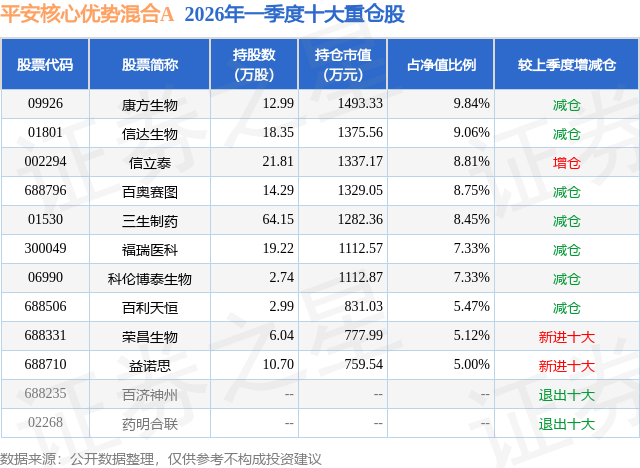 从基金规模来看,平安核心优势混合A基金2026年一季度公布的基金规模为0.6亿元,较上一期规模491.17万元变化了5471.97万元,环比变化了1114.07%。该基金最新一期资产配置为:股票占净值比92.87%,债券占净值比4.79%,现金占净值比1.13%。从基金持仓来看,该基金当季前十大股票仓位达75.16%,第一大重仓股为康方生物(09926),持仓占比为9.84%。