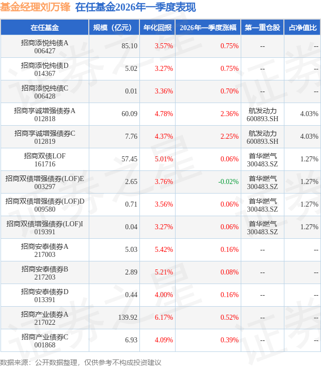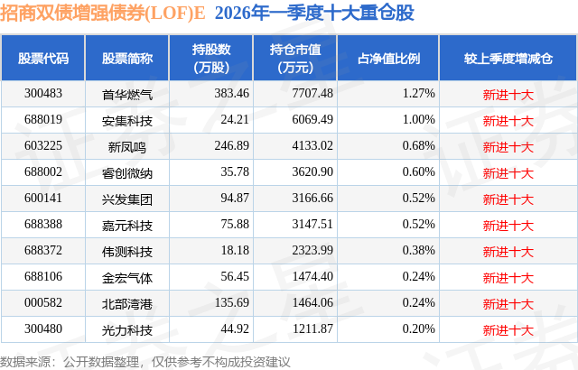 从基金规模来看,招商双债增强债券(LOF)E基金2026年一季度公布的基金规模为2.65亿元,较上一期规模5.86亿元变化了-3.21亿元,环比变化了-54.83%。该基金最新一期资产配置为:股票占净值比5.73%,债券占净值比108.65%,现金占净值比4.05%。从基金持仓来看,该基金当季前十大股票仓位达5.65%,第一大重仓股为首华燃气(300483),持仓占比为1.27%。