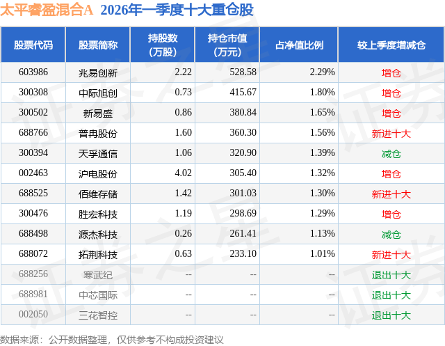 证券之星消息,日前太平睿盈混合A基金公布一季报,2026年一季度最新规模1.84亿元,季度净值涨幅为1.11%。