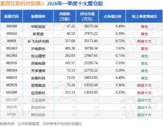 从基金规模来看,富国互联科技股票A基金2026年一季度公布的基金规模为30.7亿元,较上一期规模25.28亿元变化了5.42亿元,环比变化了21.44%。该基金最新一期资产配置为:股票占净值比88.5%,无债券类资产,现金占净值比12.61%。从基金持仓来看,该基金当季前十大股票仓位达63.93%,第一大重仓股为中际旭创(300308),持仓占比为9.49%。