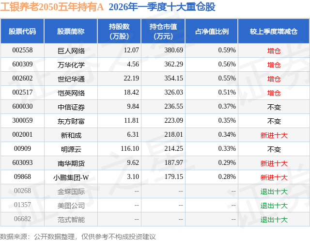 从基金规模来看,工银养老2050五年持有A基金2026年一季度公布的基金规模为1.5亿元,较上一期规模1.4亿元变化了1040.69万元,环比变化了7.44%。该基金最新一期资产配置为:股票占净值比7.52%,债券占净值比6.89%,现金占净值比1.41%。从基金持仓来看,该基金当季前十大股票仓位达4.17%,第一大重仓股为巨人网络(002558),持仓占比为0.59%。