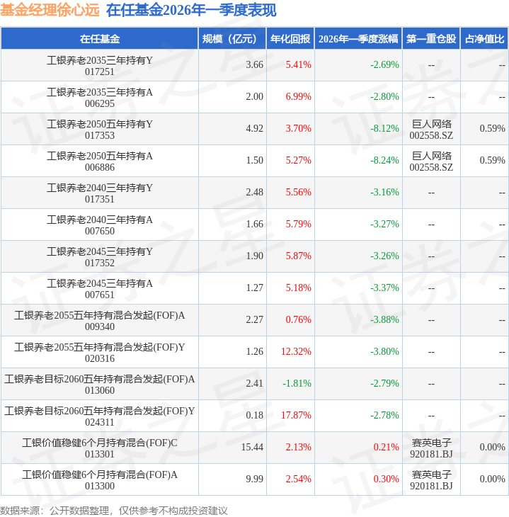 证券之星消息,日前工银养老2050五年持有A基金公布一季报,2026年一季度最新规模1.5亿元,季度净值涨幅为-8.24%。