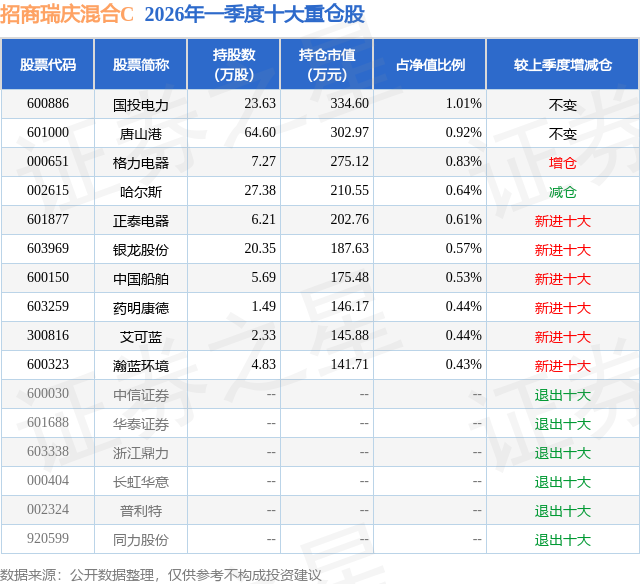 证券之星消息,日前招商瑞庆混合C基金公布一季报,2026年一季度最新规模0.39亿元,季度净值涨幅为0.49%。