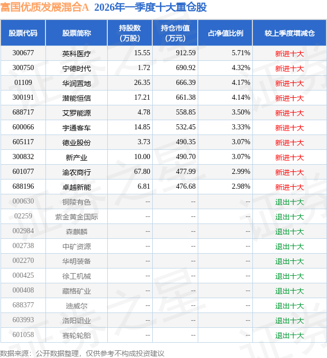 从基金规模来看,富国优质发展混合A基金2026年一季度公布的基金规模为1.2亿元,较上一期规模2.84亿元变化了-1.63亿元,环比变化了-57.62%。该基金最新一期资产配置为:股票占净值比84.59%,无债券类资产,现金占净值比16.32%。从基金持仓来看,该基金当季前十大股票仓位达37.28%,第一大重仓股为英科医疗(300677),持仓占比为5.71%。