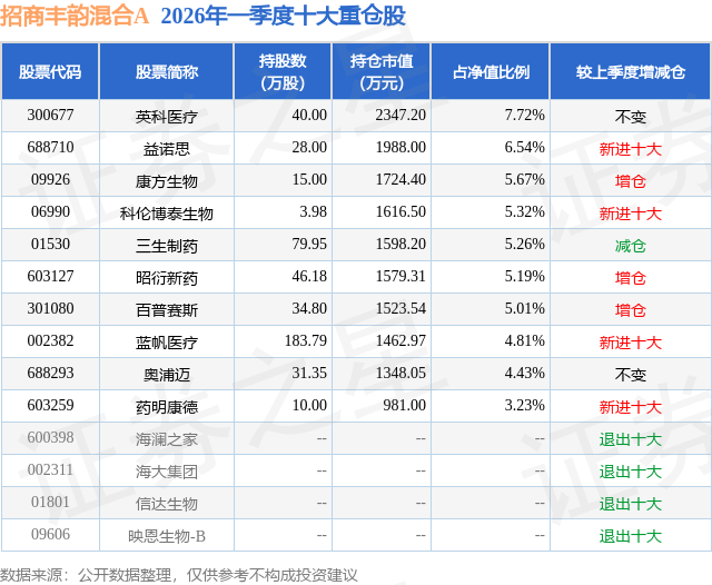 从基金规模来看,招商丰韵混合A基金2026年一季度公布的基金规模为1.99亿元,较上一期规模2.19亿元变化了-1981.4万元,环比变化了-9.05%。该基金最新一期资产配置为:股票占净值比92.08%,债券占净值比0.3%,现金占净值比8.55%。从基金持仓来看,该基金当季前十大股票仓位达53.18%,第一大重仓股为英科医疗(300677),持仓占比为7.72%。