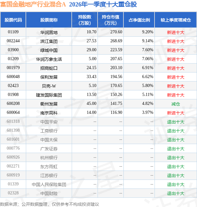 从基金规模来看,富国金融地产行业混合A基金2026年一季度公布的基金规模为0.24亿元,较上一期规模1.36亿元变化了-1.12亿元,环比变化了-82.29%。该基金最新一期资产配置为:股票占净值比69.9%,无债券类资产,现金占净值比26.4%。从基金持仓来看,该基金当季前十大股票仓位达66.23%,第一大重仓股为华润置地(01109),持仓占比为9.2%。