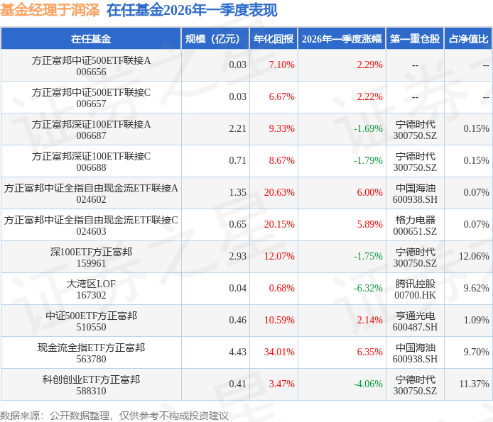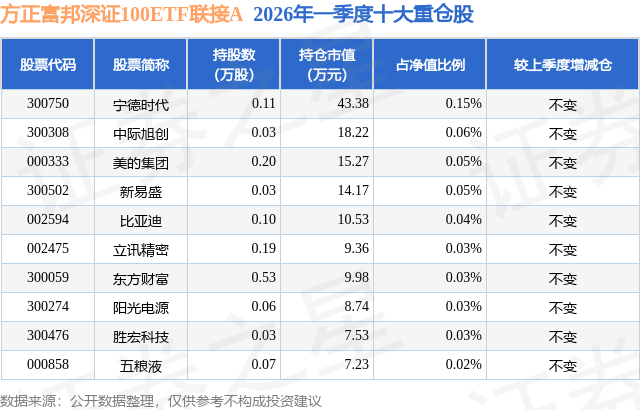 从基金规模来看,方正富邦深证100ETF联接A基金2026年一季度公布的基金规模为2.21亿元,较上一期规模4.03亿元变化了-1.83亿元,环比变化了-45.27%。该基金最新一期资产配置为:股票占净值比1.18%,无债券类资产,现金占净值比6.04%。从基金持仓来看,该基金当季前十大股票仓位达0.49%,第一大重仓股为宁德时代(300750),持仓占比为0.15%。