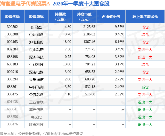 从基金规模来看,海富通电子传媒股票A基金2026年一季度公布的基金规模为0.61亿元,较上一期规模9582.43万元变化了-3481.33万元,环比变化了-36.33%。该基金最新一期资产配置为:股票占净值比93.23%,债券占净值比2.51%,现金占净值比5.36%。从基金持仓来看,该基金当季前十大股票仓位达45.66%,第一大重仓股为新易盛(300502),持仓占比为9.57%。