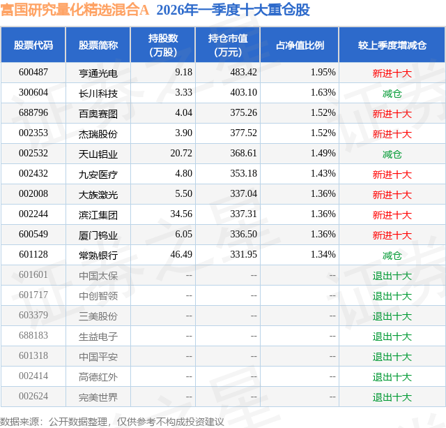 从基金规模来看,富国研究量化精选混合A基金2026年一季度公布的基金规模为2.24亿元,较上一期规模2.08亿元变化了1588.63万元,环比变化了7.63%。该基金最新一期资产配置为:股票占净值比86.51%,债券占净值比5.25%,现金占净值比6.81%。从基金持仓来看,该基金当季前十大股票仓位达14.96%,第一大重仓股为亨通光电(600487),持仓占比为1.95%。