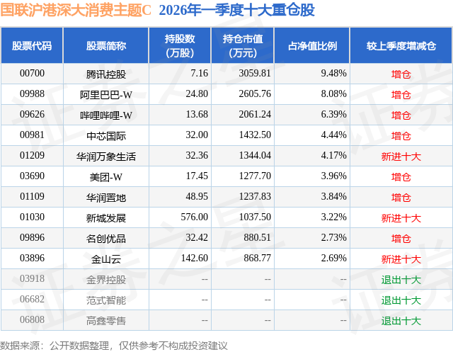 从基金规模来看,国联沪港深大消费主题C基金2026年一季度公布的基金规模为2.31亿元,较上一期规模1537.0万元变化了2.16亿元,环比变化了1402.82%。该基金最新一期资产配置为:股票占净值比87.14%,债券占净值比2.69%,现金占净值比9.7%。从基金持仓来看,该基金当季前十大股票仓位达49.0%,第一大重仓股为腾讯控股(00700),持仓占比为9.48%。