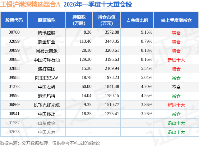 从基金规模来看,工银沪港深精选混合A基金2026年一季度公布的基金规模为2.99亿元,较上一期规模2.36亿元变化了6340.53万元,环比变化了26.87%。该基金最新一期资产配置为:股票占净值比85.23%,无债券类资产,现金占净值比5.96%。从基金持仓来看,该基金当季前十大股票仓位达61.21%,第一大重仓股为腾讯控股(00700),持仓占比为9.13%。