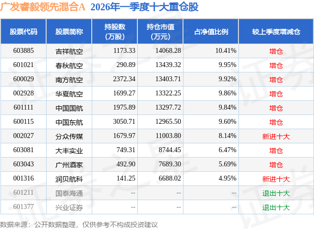 从基金规模来看,广发睿毅领先混合A基金2026年一季度公布的基金规模为9.44亿元,较上一期规模21.33亿元变化了-11.89亿元,环比变化了-55.76%。该基金最新一期资产配置为:股票占净值比94.2%,债券占净值比0.56%,现金占净值比5.7%。从基金持仓来看,该基金当季前十大股票仓位达84.83%,第一大重仓股为吉祥航空(603885),持仓占比为10.41%。