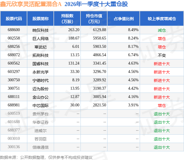 从基金规模来看,鑫元欣享灵活配置混合A基金2026年一季度公布的基金规模为5.75亿元,较上一期规模2.7亿元变化了3.05亿元,环比变化了113.17%。该基金最新一期资产配置为:股票占净值比87.58%,债券占净值比5.72%,现金占净值比4.04%。从基金持仓来看,该基金当季前十大股票仓位达57.88%,第一大重仓股为皖仪科技(688600),持仓占比为8.49%。