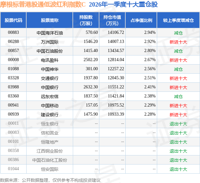从基金规模来看,摩根标普港股通低波红利指数C基金2026年一季度公布的基金规模为19.33亿元,较上一期规模7.85亿元变化了11.48亿元,环比变化了146.18%。该基金最新一期资产配置为:股票占净值比91.54%,无债券类资产,现金占净值比10.27%。从基金持仓来看,该基金当季前十大股票仓位达25.76%,第一大重仓股为中国海洋石油(00883),持仓占比为2.94%。
