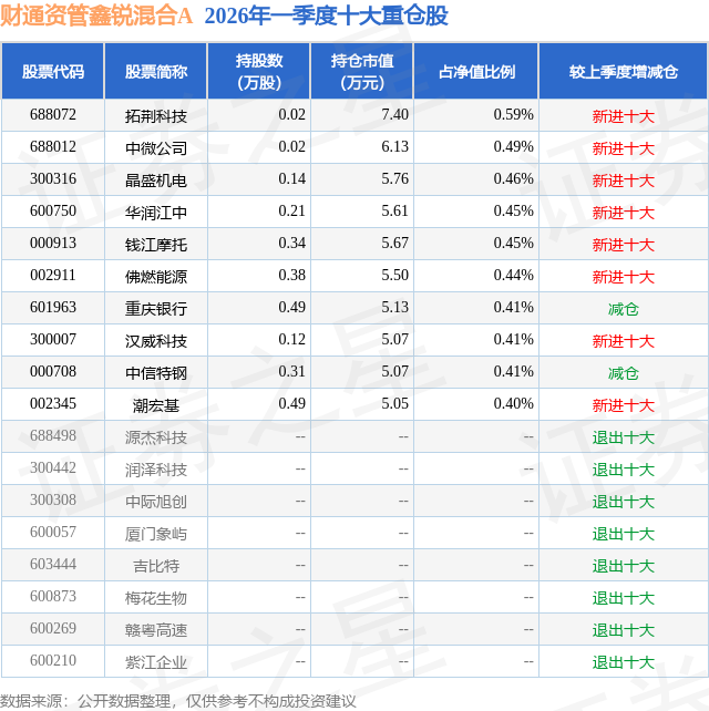 证券之星消息,日前财通资管鑫锐混合A基金公布一季报,2026年一季度最新规模0.05亿元,季度净值涨幅为-0.68%。