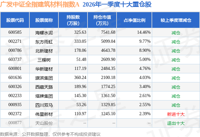 证券之星消息,日前广发中证全指建筑材料指数A基金公布一季报,2026年一季度最新规模2.0亿元,季度净值涨幅为0.93%。