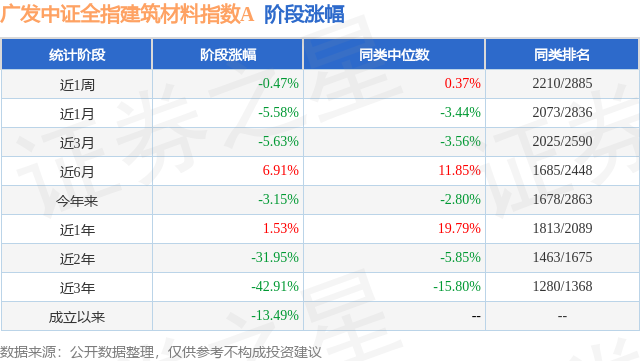 从业绩表现来看,广发中证全指建筑材料指数A基金过去一年净值涨幅为6.96%,在同类基金中排名2524/3002,同类基金过去一年净值涨幅中位数为30.71%。而基金过去一年的最大回撤为-16.27%,成立以来的最大回撤为-58.04%。