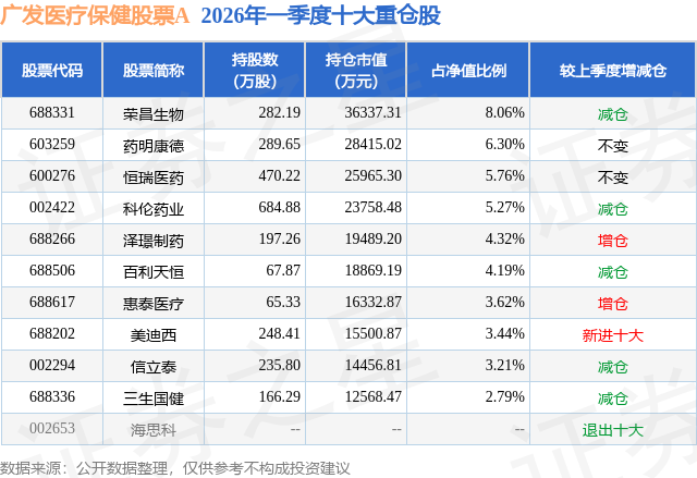 从基金规模来看,广发医疗保健股票A基金2026年一季度公布的基金规模为39.07亿元,较上一期规模51.29亿元变化了-12.22亿元,环比变化了-23.83%。该基金最新一期资产配置为:股票占净值比81.63%,无债券类资产,现金占净值比18.3%。从基金持仓来看,该基金当季前十大股票仓位达46.96%,第一大重仓股为荣昌生物(688331),持仓占比为8.06%。