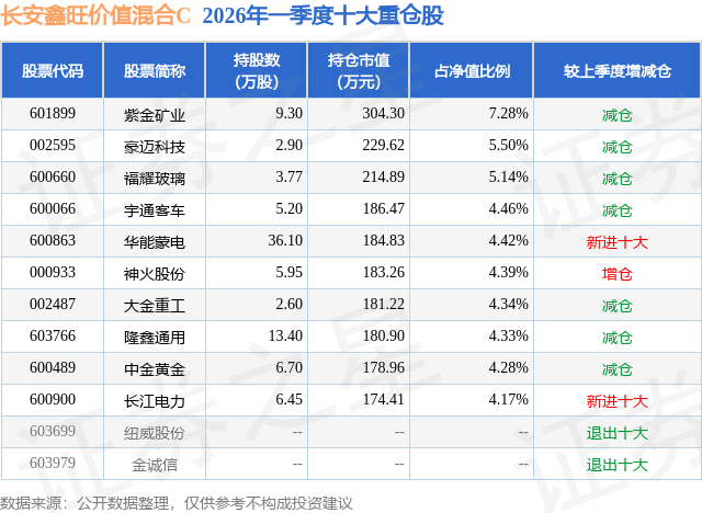 从基金规模来看,长安鑫旺价值混合C基金2026年一季度公布的基金规模为0.18亿元,较上一期规模3418.84万元变化了-1575.0万元,环比变化了-46.07%。该基金最新一期资产配置为:股票占净值比84.59%,无债券类资产,现金占净值比15.03%。从基金持仓来看,该基金当季前十大股票仓位达48.31%,第一大重仓股为紫金矿业(601899),持仓占比为7.28%。