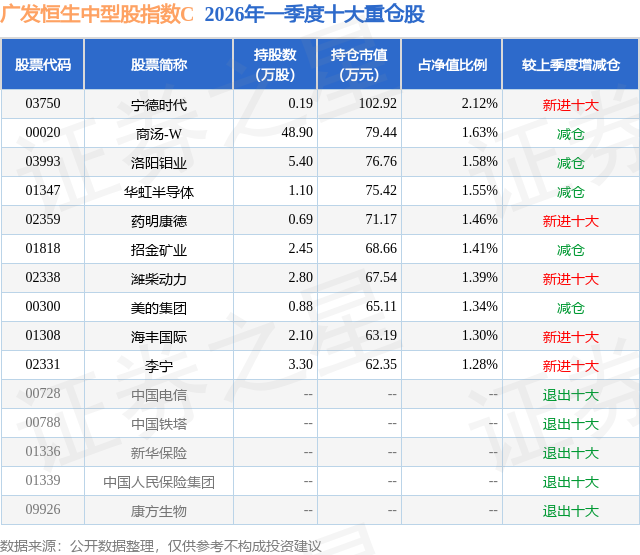 从基金规模来看,广发恒生中型股指数C基金2026年一季度公布的基金规模为0.05亿元,较上一期规模786.35万元变化了-276.35万元,环比变化了-35.14%。该基金最新一期资产配置为:股票占净值比91.63%,无债券类资产,现金占净值比8.38%。从基金持仓来看,该基金当季前十大股票仓位达15.06%,第一大重仓股为宁德时代(03750),持仓占比为2.12%。