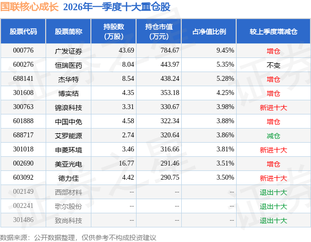 从基金规模来看,国联核心成长基金2026年一季度公布的基金规模为0.83亿元,较上一期规模7786.77万元变化了515.54万元,环比变化了6.62%。该基金最新一期资产配置为:股票占净值比82.06%,债券占净值比5.7%,现金占净值比12.63%。从基金持仓来看,该基金当季前十大股票仓位达46.87%,第一大重仓股为广发证券(000776),持仓占比为9.45%。