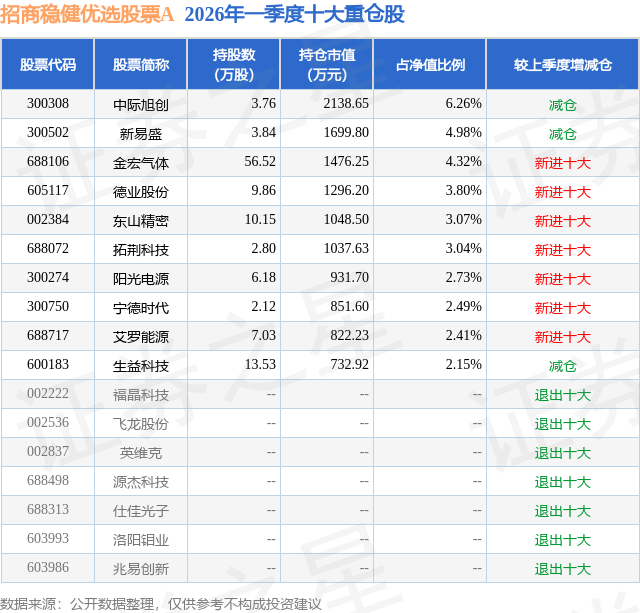 从基金规模来看,招商稳健优选股票A基金2026年一季度公布的基金规模为3.14亿元,较上一期规模2.99亿元变化了1435.64万元,环比变化了4.8%。该基金最新一期资产配置为:股票占净值比81.79%,债券占净值比0.27%,现金占净值比17.98%。从基金持仓来看,该基金当季前十大股票仓位达35.25%,第一大重仓股为中际旭创(300308),持仓占比为6.26%。