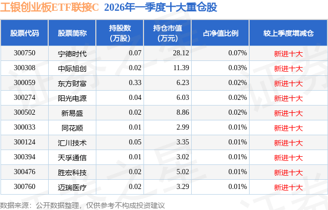 从基金规模来看,工银创业板ETF联接C基金2026年一季度公布的基金规模为2.12亿元,较上一期规模1.82亿元变化了2999.68万元,环比变化了16.48%。该基金最新一期资产配置为:股票占净值比0.34%,无债券类资产,现金占净值比7.45%。从基金持仓来看,该基金当季前十大股票仓位达0.21%,第一大重仓股为宁德时代(300750),持仓占比为0.07%。