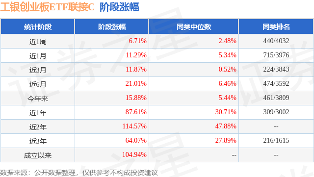 从业绩表现来看,工银创业板ETF联接C基金过去一年净值涨幅为87.61%,在同类基金中排名309/3002,同类基金过去一年净值涨幅中位数为30.71%。而基金过去一年的最大回撤为-11.55%,成立以来的最大回撤为-54.35%。